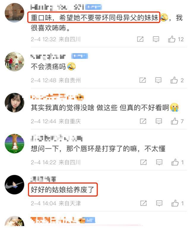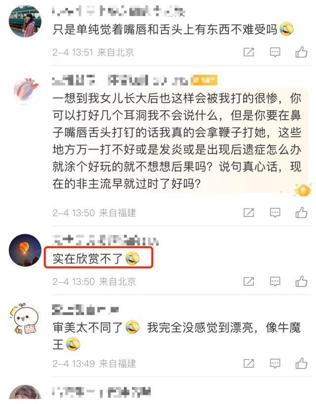 梧桐妹在决定穿鼻环之前,也有问过姆妈的观念,贾静雯那时就莫得反对,而是尊重儿子的思法,仅仅派遣她我方不要后悔就好,如今梧桐妹又打了舌环跟唇环,思必亦然历程了贾静雯甘愿的。